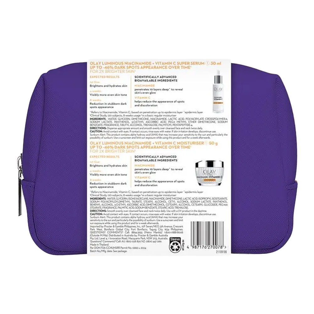 Olay Luminous Niacinamide and Vitamin C skincare set with serum and moisturiser in purple pouch