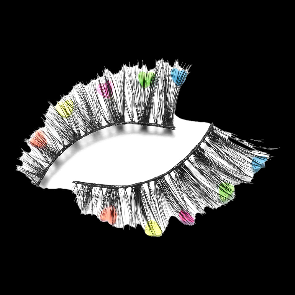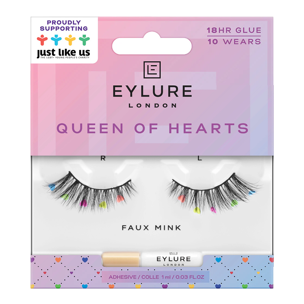 Add a gorgeous pop of colour to your lashes with Eylure Pride Lashes in style Queen of Hearts. Queen of Hearts lashes by Eylure boast a flared lash design with super wispy clusters. These lashes are ideal for a natural-looking, lifted effect once applied. Eylure Queen of Hearts lashes feature bright-coloured love hearts scattered along the lash strands.